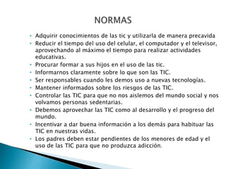 Este documento discute la influencia de las tecnologías de la información y la comunicación (TIC) en los niños y la sociedad. Señala que las TIC pueden promover la comunicación, educación y progreso, pero también pueden causar adicción y aislamiento si no se usan de manera responsable. Recomienda que los padres eduquen e informen a los niños sobre el uso adecuado de las TIC para que éstas beneficien su desarrollo y no tengan efectos perjudiciales.