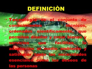 El documento define la tecnología como el conjunto de conocimientos técnicos ordenados científicamente que permiten crear bienes y servicios para satisfacer las necesidades humanas y adaptarse al medio ambiente. Explica que la tecnología se caracteriza por la especialización creciente, la integración cada vez más compleja de sus partes, y el cambio discontinuo y revolucionario. Además, señala que la tecnología requiere mayor movilidad para ajustarse a los cambios rápidos que genera en el trabajo y la sociedad.