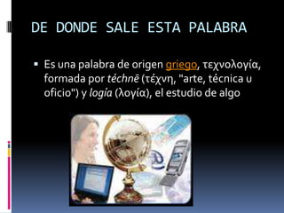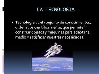 La tecnología se refiere al conjunto de conocimientos científicos que permiten construir objetos y máquinas para satisfacer necesidades humanas. La palabra tecnología proviene del griego y significa el estudio de las artes y técnicas. La actividad tecnológica ha influido en el progreso social y económico pero también ha causado deterioro ambiental. Las tecnologías pueden usarse para proteger el medio ambiente y evitar la escasez de recursos. Algunos hitos tecnológicos prehistó