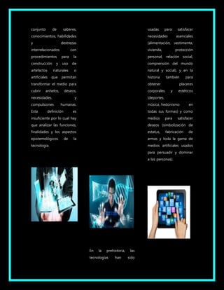 La tecnología se define como el conjunto de conocimientos técnicos y científicos que permiten diseñar bienes y servicios para satisfacer las necesidades y deseos humanos, así como facilitar la adaptación al medio ambiente. La tecnología influye en el progreso social y económico, aunque su enfoque comercial tiende a satisfacer más los deseos de los ricos que las necesidades básicas de los pobres. En la prehistoria y la historia, la tecnología se ha usado para satisfacer necesidades como la alimentación y vest