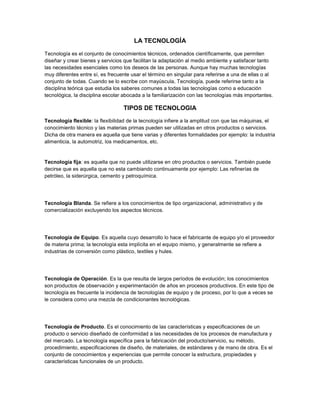 La tecnología se refiere al conjunto de conocimientos técnicos ordenados científicamente que permiten crear bienes y servicios para satisfacer las necesidades humanas y adaptarse al medio ambiente. Existen varios tipos de tecnología, incluyendo tecnología flexible, que puede usarse en diferentes productos; tecnología fija, que no puede adaptarse fácilmente; tecnología blanda relacionada a aspectos administrativos; tecnología de equipo enfocada en el equipamiento; tecnología de operación basada en procesos;