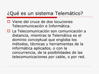 La Telemática combina las telecomunicaciones y la informática para permitir la comunicación a distancia. Esto incluye el intercambio de información entre computadoras conectadas a través de redes locales o Internet. Las redes telemáticas permiten compartir recursos, conectividad y distribuir el trabajo entre equipos de forma fiable e independiente del lugar. Aplicaciones como el correo electrónico y las videoconferencias posibilitan la comunicación simultánea o diferida entre individuos, grupos y centros de documentación con fines educativos.