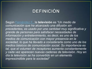 El documento resume las opiniones de Fernández sobre la televisión como un medio de comunicación masivo e importante en la sociedad. También clasifica los diferentes tipos de programación de televisión según la Ley de Radio y Televisión Mexicana e identifica elementos clave del lenguaje audiovisual en televisión como texto, imagen, sonido y voz. Finalmente, analiza las ventajas y desventajas del tiempo que los niños y estudiantes pasan frente a la televisión.