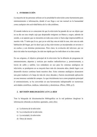 La televisión ha evolucionado rápidamente desde su invención, pasando de transmisiones en blanco y negro a dispositivos en color, de alta definición y con acceso a Internet. Se espera que los avances en nanotecnología generen una gran revolución, con televisores que estimulen los sentidos y permitan ver programación directamente a través de implantes oculares. La sociedad también ha cambiado su relación con la televisión, que ya no solo entretiene sino que influye en los estilos de vida.