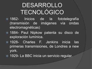 Este documento describe la historia y el desarrollo de la televisión desde sus inicios en el siglo XIX hasta la actualidad. Comenzó con experimentos en la transmisión de imágenes a distancia y el desarrollo del disco de exploración de Nipkow en 1884. En la década de 1920 se realizaron las primeras transmisiones regulares de audio y video. La televisión en color se introdujo en la década de 1960 y los avances tecnológicos desde entonces incluyen pantallas de plasma, LCD y alta definición.