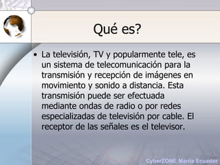 La televisión es un sistema de telecomunicación para la transmisión de imágenes y sonido a distancia a través de ondas de radio o cable. Fue inventada en la década de 1920 y las primeras emisiones públicas ocurrieron en 1927 en Inglaterra y 1930 en Estados Unidos. A lo largo de las décadas siguientes, la televisión evolucionó hacia formatos más portátiles, la transmisión vía satélite, y la alta definición.
