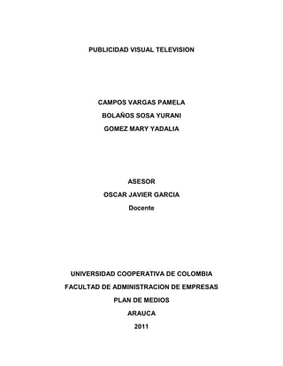 Este documento presenta un plan de medios para la ciudad de Arauca en 2011. Incluye información sobre la definición y antecedentes de la televisión, la población objetiva, los tipos de anuncios y los costos de publicidad en el canal Caracol para el mes de agosto de 2011. Entre otros detalles, provee las tarifas para anuncios en diferentes programas de entretenimiento, noticias y eventos deportivos.