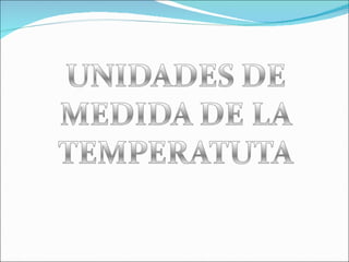 El documento describe los diferentes tipos de termómetros y unidades de medición de temperatura. Explica que los termómetros miden la temperatura aprovechando fenómenos como la dilatación de líquidos o resistencia eléctrica que varía con la temperatura. Describe termómetros de vidrio, resistencia, contacto, infrarrojos, bimétalicos, de gas y digitales. También explica las escalas Celsius, Kelvin y Fahrenheit y sus puntos de referencia.