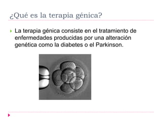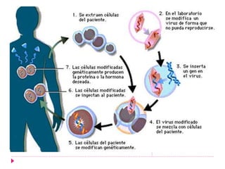 La terapia génica consiste en el tratamiento de enfermedades genéticas mediante la introducción de genes en células. Se ha estudiado desde 1970 y la primera transferencia de genes a humanos fue en 1989. Existen dos métodos: terapia génica in vivo e introduciendo genes directamente en el cuerpo, y ex vivo extraiendo células, modificándolas en el laboratorio y reintroduciéndolas. Se ha utilizado para tratar enfermedades unigénicas, cáncer e infecciones, principalmente en el tejido hematopoyético