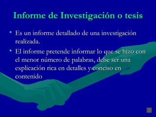 El documento es un informe detallado sobre la organización y estructura de un informe de investigación o tesis, que incluye secciones como la portada, dedicatoria, tabla de contenido, resumen, introducción, metodología, resultados, discusión, conclusiones, recomendaciones, agradecimientos y referencias. Cada sección tiene pautas específicas sobre su contenido y presentación para lograr una comunicación clara y concisa. Se enfatiza la importancia de un resumen efectivo que permita al lector evaluar el interés de la investigación.