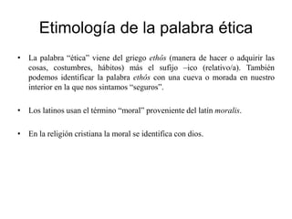 El documento resume la historia de la ética desde sus orígenes en la antigua Grecia hasta la ética aplicada contemporánea. Explica las definiciones y diferencias entre ética y moral, y destaca las contribuciones de filósofos como Sócrates, Platón, Aristóteles, Kant y autores medievales como Santo Tomás de Aquino. También describe ejemplos de códigos morales antiguos y áreas como la bioética y ética empresarial en las que se aplica la ética hoy en día.