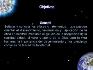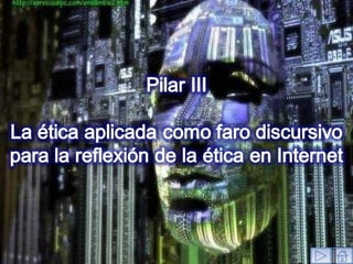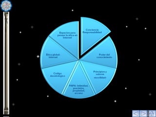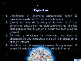El documento aborda la necesidad de desarrollar una ética ciberespacial que fomente la responsabilidad y la reflexión de los usuarios de Internet, dado que la falta de regulación en el ciberespacio promueve el individualismo y el permisivismo. Se discute la importancia de una ética aplicada que contemple la pluralidad y dinámica del entorno digital, proponiendo que los usuarios deben ser conscientes de las implicaciones morales de sus actos en la red. Finalmente, se sugieren espacios de diálogo y educación sobre principios éticos para lograr una convivencia armónica en el ciberespacio.
