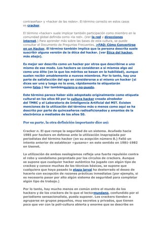 Este documento explica las diferencias entre un hacker, un cracker y un phreaker. Define a un hacker como alguien que disfruta explorando sistemas programables y aprendiendo cómo funcionan, mientras que un cracker rompe la seguridad de sistemas de forma maliciosa. Los hackers consideran a los crackers como una forma de vida inferior y se distancian de sus actividades ilegales. El documento también discute la ética del hacker y cómo los medios a menudo representan incorrectamente a los hackers.