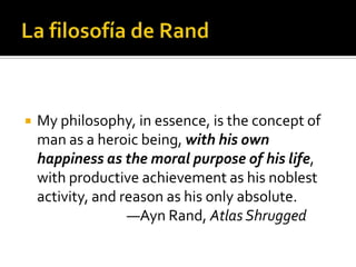 La ética individualista de Ayn Rand se centra en el concepto de egoísmo racional, donde la felicidad personal es el propósito moral de la vida y la razón es el único medio para alcanzarla. El objetivismo, como filosofía, defiende que la vida del hombre es el estándar de valoración y promueve un capitalismo laissez-faire, donde los individuos actúan como fines en sí mismos. Rand critica el altruismo y sostiene que la búsqueda de la realización personal y los valores objetivos son esenciales para una sociedad ideal.