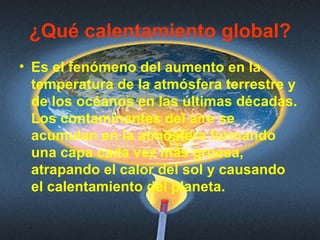 El documento resume las causas y consecuencias del calentamiento global, incluyendo el aumento de la temperatura debido a la acumulación de contaminantes en la atmósfera, el derretimiento de glaciares, sequías, huracanes y el aumento del nivel del mar. Explica cómo evitarlo mediante la reducción de emisiones de vehículos, uso de energías renovables, reforestación y técnicas agrícolas limpias. También menciona acciones que los ciudadanos pueden tomar como usar transporte público, comprar artefactos eficientes y