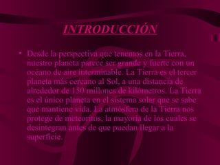 La Tierra es el tercer planeta del sistema solar y el único que mantiene vida. Se compone de una corteza, manto y núcleo. La corteza está dividida en placas tectónicas que se mueven lentamente, lo que da forma al relieve terrestre. La atmósfera protege la Tierra y posibilita la vida al proporcionar oxígeno.