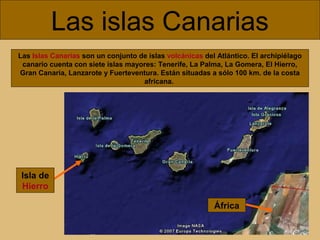 Este documento describe las capas internas de la Tierra, incluyendo la corteza, el manto y el núcleo. También describe las características de las Islas Canarias, incluyendo recientes erupciones volcánicas e terremotos en la isla de El Hierro. Explica cómo las rocas de la corteza cambian debido a procesos como la erosión por el agua, el viento y el hielo.