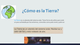 La Tierra es un planeta esférico situado a una distancia del Sol que permite la vida, rodeado por una atmósfera protectora y con grandes cantidades de agua. Se compone de una hidrosfera azul formada por los océanos, una geosfera marrón y verde constituida por los continentes y una atmósfera blanca compuesta por el aire.