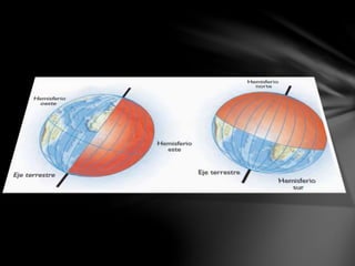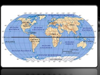 El documento describe cómo se utilizan las líneas imaginarias como el Ecuador y el Meridiano de Greenwich para ubicar lugares en la Tierra. El Ecuador divide la Tierra en dos hemisferios norte y sur, mientras que el Meridiano de Greenwich divide la Tierra en hemisferios occidental y oriental. Los paralelos y meridianos se usan para medir la latitud y longitud de cualquier lugar, lo que permite ubicarlo de manera exacta.