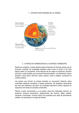 El documento describe los procesos geológicos que formaron la corteza terrestre y cómo se mueven las placas tectónicas, generando fenómenos como volcanes y terremotos. Explica que los terremotos son causados por la liberación repentina de energía cuando las placas se mueven bruscamente, y que se miden en la escala de Richter. También define qué son los tsunamis y cómo se usan las coordenadas de latitud y longitud para ubicar puntos en la Tierra.