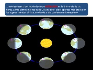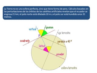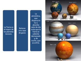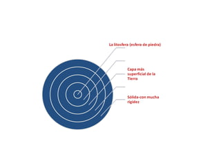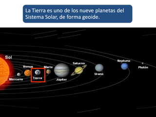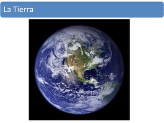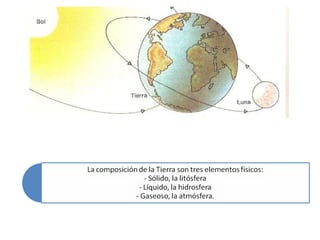 1) El documento presenta información sobre la Tierra como planeta, incluyendo sus características físicas y componentes como la litosfera, hidrosfera, atmósfera y sus capas.