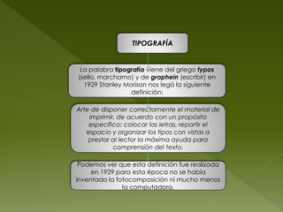 Este documento trata sobre la tipografía y su evolución. Explica que la tipografía se refiere al arte de disponer letras de forma correcta para ayudar a la comprensión del lector. También describe las diferentes partes que componen una letra y cómo se han clasificado históricamente las fuentes tipográficas dependiendo de la presencia o ausencia de remates y la forma de sus trazos.