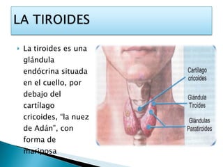 La tiroides es una glándula en forma de mariposa situada en el cuello que produce hormonas tiroideas como la tiroxina y la triyodotironina, las cuales regulan el metabolismo y el crecimiento. La tiroides secreta estas hormonas que afectan procesos como la síntesis de proteínas, el uso de glucosa y la formación de vitamina A. Las hormonas tiroideas también son esenciales para el desarrollo del sistema nervioso y los dientes.