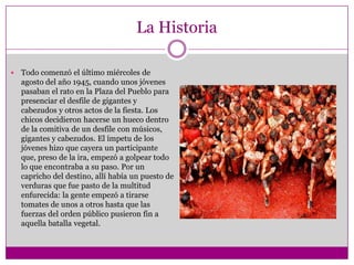 La Tomatina es una batalla con tomates que se celebra anualmente en Buñol, España. Comenzó de forma espontánea en 1945 cuando los jóvenes empezaron a lanzarse tomates durante las fiestas locales. Aunque fue prohibida brevemente en los años 50, la tradición continuó y la fiesta se ha convertido en un evento turístico internacional que atrae a decenas de miles de personas cada año para participar en la gigantesca guerra de tomates.