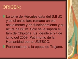 La Torre de Hércules data del siglo II d.C. y es el único faro romano en pie actualmente. Según la leyenda, Hércules enterró la cabeza de un gigante allí cuando desembarcó. El faro se usaba para la navegación y fue construido entre los años 40-80 d.C. por el arquitecto Cayo Eusebio Lupo.