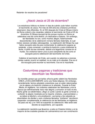 El documento discute las tradiciones de la Navidad, señalando que aunque originalmente era una celebración cristiana del nacimiento de Jesús, con el tiempo se han agregado muchas costumbres seculares y paganas que desvirtúan el significado religioso. Si bien algunas tradiciones como los árboles de Navidad tienen orígenes paganos, los cristianos pueden usarlos para recordar el nacimiento de Cristo en lugar de adorarlos. La fecha del 25 de diciembre tampoco es bíblica sino que fue escogida por el ob