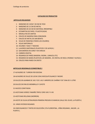 Este catálogo de productos de La Rioja, Argentina incluye artículos religiosos como imágenes, cruces y velas; comestibles regionales como alfajores, dulces, aceitunas y vinos; artículos de vestir como ponchos y sombreros; e instrumentos musicales como quenas. El catálogo también proporciona descripciones y precios de cada artículo.