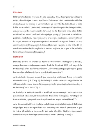 La traducción consiste en comprender el significado de un texto en un idioma y producir un texto equivalente en otro idioma. A lo largo de la historia ha habido muchos intentos de definir la traducción, incluyendo: verla como una actividad entre lenguas, una actividad entre textos, un acto de comunicación, un proceso, y una actividad textual, comunicativa y cognitiva que involucra la reformulación de un texto en otro idioma en un contexto social.