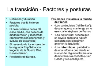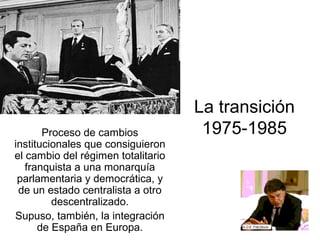 La transición en España entre 1975-1985 fue un proceso de cambios institucionales que transformó el régimen franquista totalitario en una monarquía parlamentaria y democracia descentralizada e integró a España en Europa. Factores como el desarrollismo de los 60, el recuerdo de los errores de la Segunda República y la presión europea hicieron posible la transición, a pesar de las dificultades planteadas por el terrorismo y los grupos radicales de extrema derecha e izquierda.
