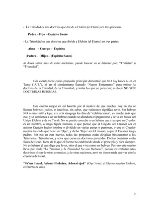 Este documento discute el origen no hebreo de las doctrinas de la Trinidad y la Triunidad. Argumenta que estas doctrinas se originaron en el pensamiento griego y pagano y fueron adoptadas por la iglesia cristiana en los concilios de Nicea y Constantinopla. También analiza textos bíblicos comúnmente usados para apoyar estas doctrinas y argumenta que deben interpretarse desde una perspectiva hebrea en lugar de griega o cristiana.