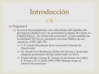 El documento aborda la visión de los adventistas del séptimo día sobre la Trinidad, defendiendo su creencia en la deidad del Padre, el Hijo y el Espíritu Santo basada en la Biblia, y refiriéndose a declaraciones de Elena G. de White que destacan su individualidad y unidad. A través de versículos bíblicos, el texto establece que cada persona de la Trinidad es divina y distinta, y concluye que la creencia en la Trinidad es fundamental en la fe adventista. Se critica la idea de que la Iglesia Adventista no cree en la Trinidad o que Elena G. de White desestima esta doctrina.