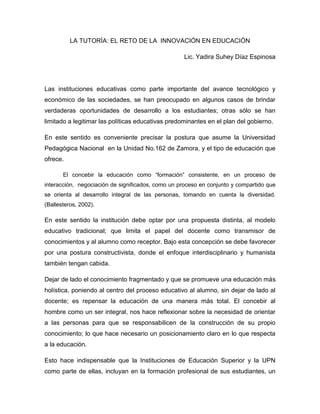 Este documento discute el desafío de la innovación en la educación, particularmente a través del programa de tutorías en la Universidad Pedagógica Nacional Unidad No. 162 en Zamora, México. Propone que la tutoría debe enfocarse en el desarrollo integral del estudiante más que en la transmisión de conocimiento, y que los tutores deben adaptarse a las necesidades individuales de cada estudiante. El programa de tutorías busca mejorar los resultados académicos, retención y desempeño profesional de los estudiantes a través de un en