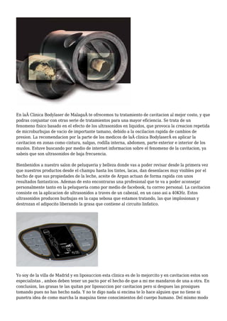 La ultracavitación es un tratamiento estético no respaldado por legislación en Argentina, que utiliza ultrasonidos para eliminar grasa en zonas específicas del cuerpo, aunque no es un método de pérdida de peso. Este procedimiento produce microburbujas que destruyen adipocitos, con resultados espectaculares pero riesgos y contraindicaciones que deben considerarse. La clínica Bodylaser en Málaga ofrece estos tratamientos, aconsejando su uso en áreas como abdomen y nalgas, aunque se debe tener precaución en la elección del profesional que opere la máquina.