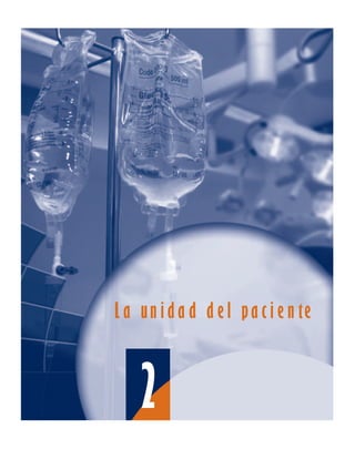 La unidad del paciente en un hospital incluye el espacio de la habitación, el mobiliario y el equipo necesario para la atención adecuada. Su diseño varía según el tipo de pacientes (niños, geriátricos, o con condiciones especiales) y debe garantizar la privacidad, comodidad y funcionalidad. Además, el mobiliario y los materiales utilizados deben fomentar la higiene y el bienestar del paciente, adaptándose a sus necesidades específicas.