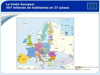 El documento describe la historia, instituciones y logros de la Unión Europea. Comenzó en 1952 con seis países fundadores y ahora tiene 27 miembros, con más de 497 millones de habitantes. Ha ampliado la paz, prosperidad y cooperación en Europa a través de la libre circulación de personas, bienes y servicios en el mercado único. También promueve valores como los derechos humanos, la democracia y la sostenibilidad ambiental.