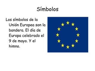 Este documento proporciona información sobre la Unión Europea, incluyendo sus símbolos, instituciones, países miembros, países candidatos, países de la zona euro y datos demográficos y políticos de cada uno de los países miembros.
