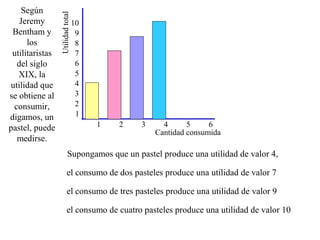 El documento explora la teoría de la utilidad según Jeremy Bentham y los utilitaristas del siglo XIX, explicando cómo se puede medir la utilidad obtenida al consumir pasteles. La utilidad marginal disminuye con cada unidad adicional consumida, y eventualmente puede llegar a ser nula o negativa. Además, se menciona la diferencia entre la utilidad discreta, referida a unidades enteras, y la utilidad continua, que incluiría fracciones del producto consumido.