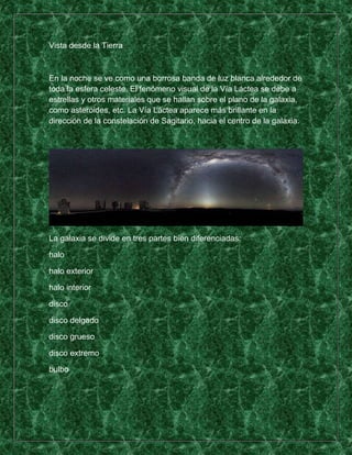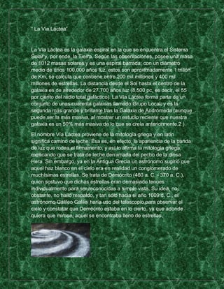 La Vía Láctea es la galaxia espiral en la que se encuentra el Sistema Solar. Contiene entre 200-400 mil millones de estrellas y su diámetro es de unos 100.000 años luz. Está compuesta de un halo, un disco con brazos espirales donde se forma estrellas, y un bulbo central con una gran densidad de estrellas y posiblemente un agujero negro supermasivo. Recibe su nombre de la leche derramada por la diosa Hera en la mitología griega, aunque en realidad es un gran número de est