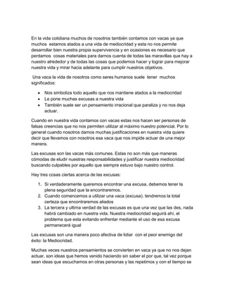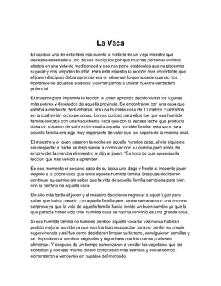 El maestro enseña a su discípulo sobre las "vacas" que mantienen a la gente atada a una vida mediocre a través de una historia. Mata a la vaca de una familia pobre para demostrar que perder algo que los limita puede conducir a un cambio positivo. Un año después, la familia había mejorado su vida al sembrar y vender vegetales. Las vacas representan pensamientos y excusas que evitan que las personas alcancen su potencial, como la culpabilización o falsas creencias. Superar las vacas permite