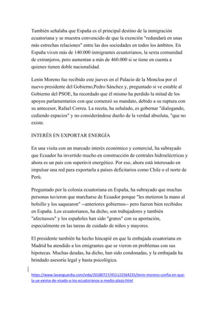 El presidente de Ecuador, Lenín Moreno, confía en que la Unión Europea exima de visado a los ecuatorianos para viajes cortos a medio plazo. Aunque España ya solicitó esta exención, las decisiones de la UE no suelen ser rápidas. Moreno también enfatizó el interés de Ecuador en exportar su superávit energético a países como Chile y el norte de Perú.