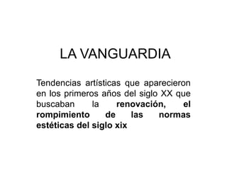 El documento explora las vanguardias artísticas del siglo XX, que surgieron como una respuesta a las normas estéticas del siglo XIX y a los contextos históricos de las guerras mundiales. Detalla movimientos como el cubismo, futurismo, expresionismo, dadaísmo y surrealismo, describiendo sus características y representantes. Se destaca la importancia de estos movimientos en la renovación del arte y la protesta contra las convenciones establecidas.