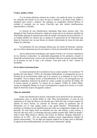 El documento discute la obsolescencia programada en productos de consumo. Explica que la obsolescencia surgió con la producción masiva y la sociedad de consumo para impulsar las ventas. Los productos se diseñan para tener una vida útil corta y no ser reparables, lo que genera residuos y derroche de recursos. Aunque algunas empresas niegan planificarla, hay ejemplos como bombillas y iPods donde se alteró deliberadamente la durabilidad para obligar a reemplazos frecuentes. La moda y el marketing también juegan un