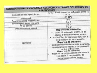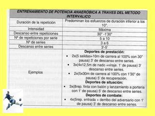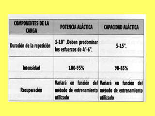 El documento define la velocidad como la capacidad psicofísica para ejecutar movimientos a la máxima velocidad posible. Explica que la velocidad depende de factores como la fuerza, resistencia, técnica, factores genéticos, sensoriales, neuronales, musculares y ambientales. Se describen distintos tipos de velocidad como la velocidad de reacción, aceleración, velocidad máxima, rapidez de movimientos y fuerza-velocidad. Los objetivos del entrenamiento de la velocidad incl