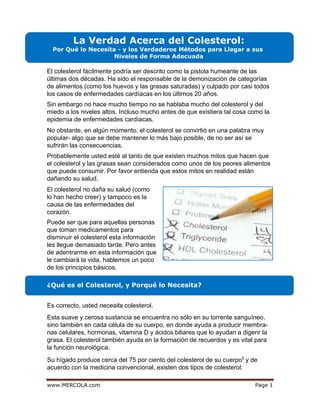 El documento explica que el colesterol es necesario para el cuerpo y no es el verdadero culpable de las enfermedades cardíacas. El colesterol ayuda a producir hormonas, membranas celulares y ácidos biliares, y es vital para la función neurológica. No existe un "colesterol bueno" o "colesterol malo", sino que el colesterol se transporta a través de la sangre unido a proteínas. Los verdaderos factores de riesgo son la relación entre colesterol HDL y trig
