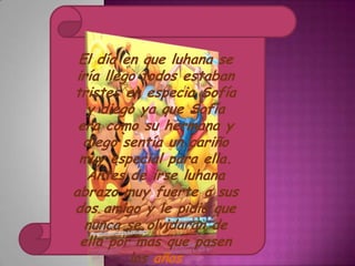 Tres niños crecieron como amigos en un orfanato. Años después, una de las niñas, Luhana, es adoptada y promete mantener el contacto, pero pierden comunicación. Más tarde, Diego y la otra niña, Sofía, ahora novios, encuentran a Luhana trabajando como enfermera en el hospital donde Sofía es tratada de leucemia. Sofía le pide a Luhana que cuide de Diego antes de morir.