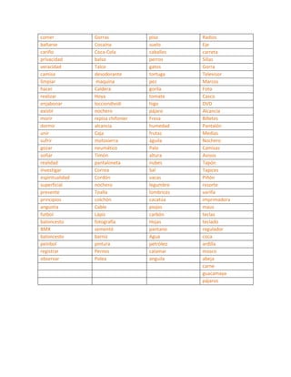 Este documento contiene una lista de palabras en español relacionadas con diferentes temas como la vida, la tecnología, el medio ambiente y la ciudad de Marinilla. Incluye términos como amor, alegría, computador, televisor, pulpo, árbol, bicicleta, motocicleta y nombres de lugares en Marinilla como bicicrós, dirt park y villas.
